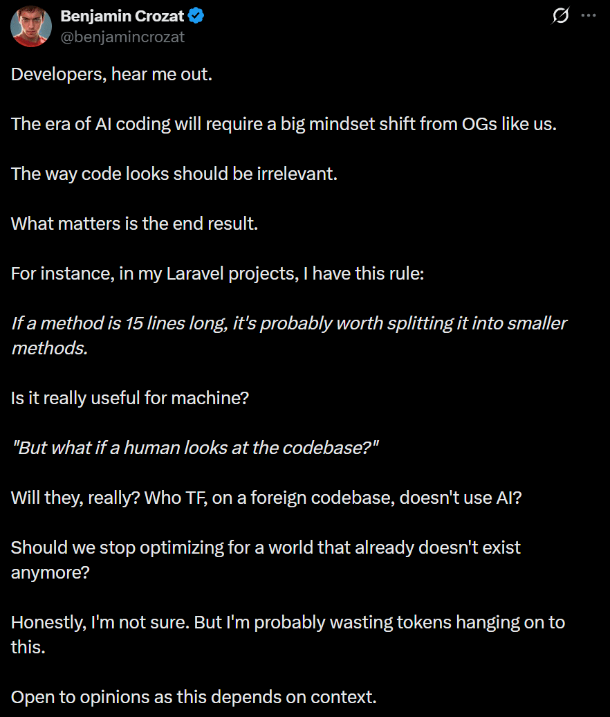 I understand the rebuttal people have. “Well, it does not even matter anymore about design. Because if AI can read the code and can write the code, and therefore change the code, it does not matter. It does not matter what type of folder structure you have, organization, it does not matter at all about the design because AI can just handle it.”