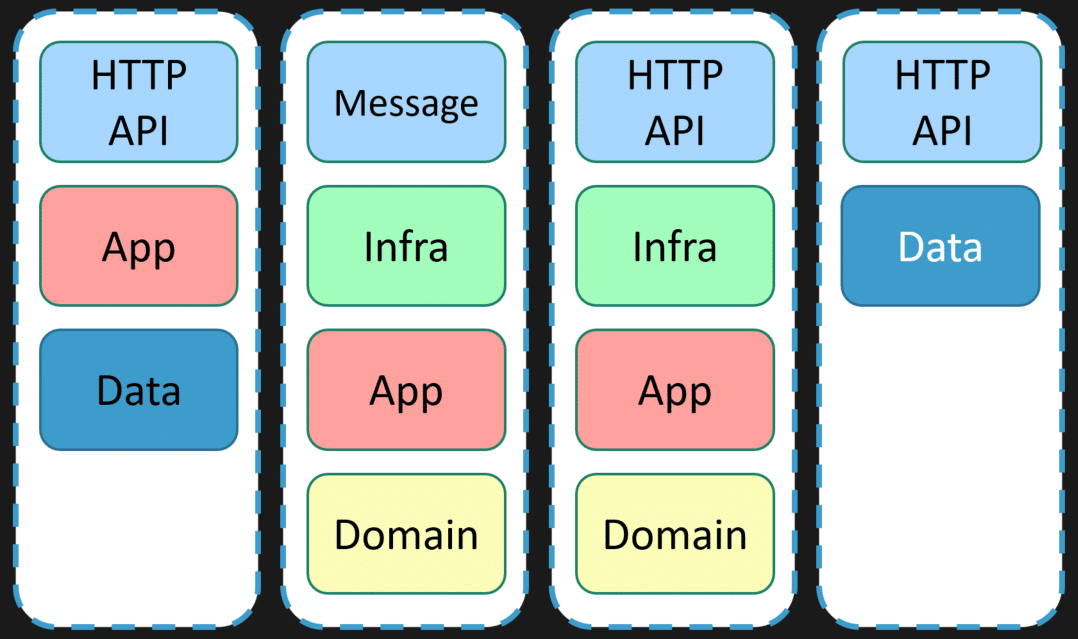 Another slice might be more elaborate. Maybe it uses messaging, infrastructure, queues, a bus, application code, and a richer domain model because there is workflow and real business complexity.
